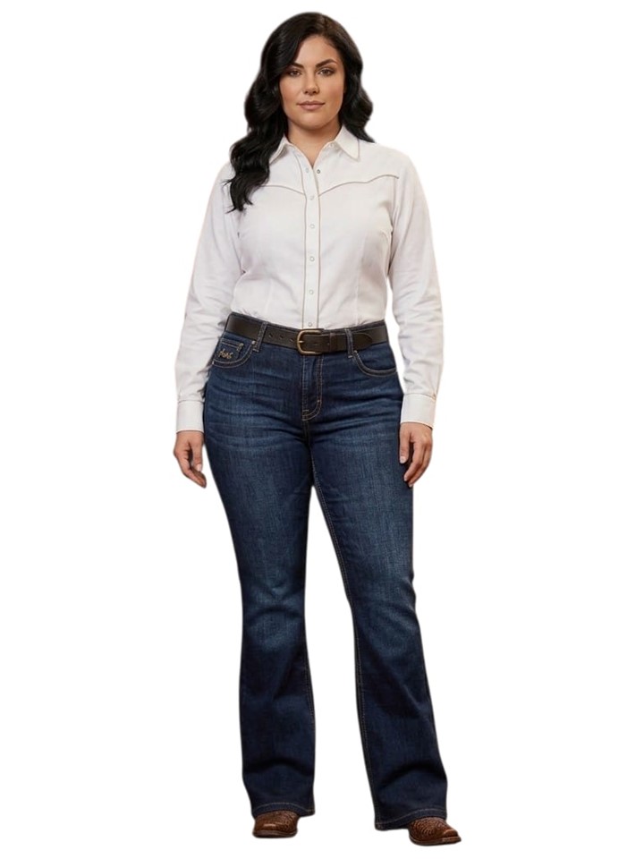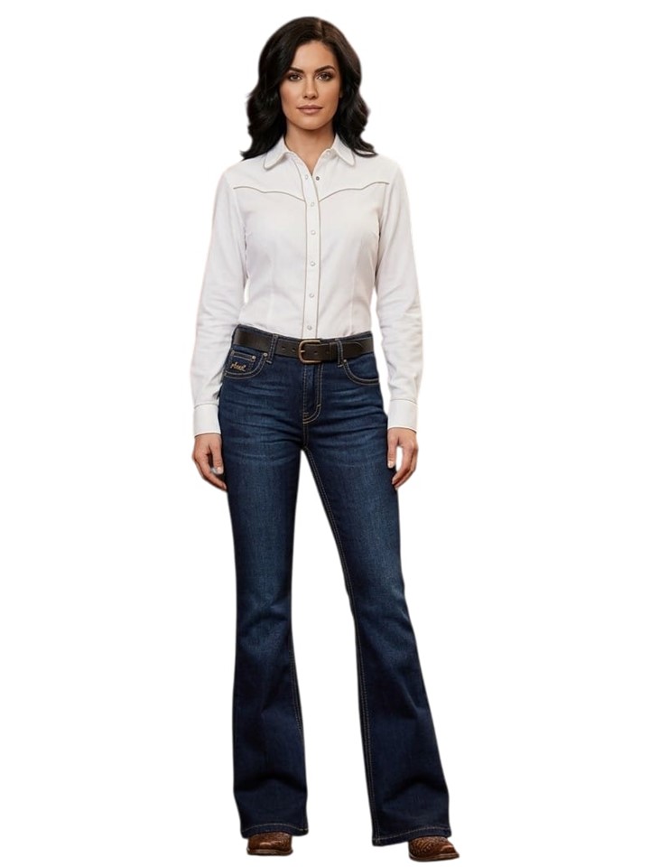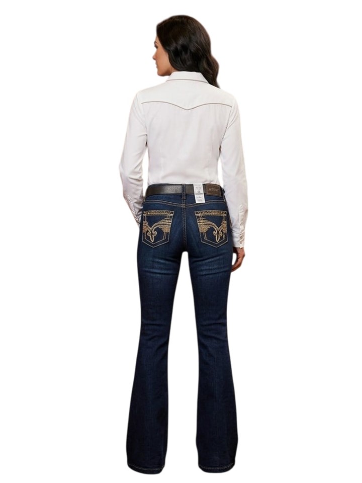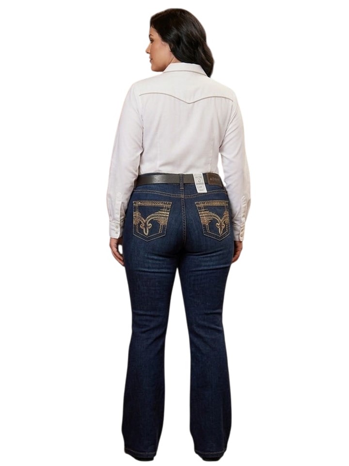 El corte flare CON SPANDEX en jeans de dama, también llamado acampanado, es un estilo que se ajusta en la cadera y muslo, pero que comienza a abrirse de forma gradual y pronunciada desde la rodilla hasta el tobillo, creando una silueta de "campana" que alarga visualmente las piernas y estiliza la figura, popularizado desde los años 70 y con un aire retro chic moderno, ideal para combinar con tacones o botas para un look femenino y sofisticado.